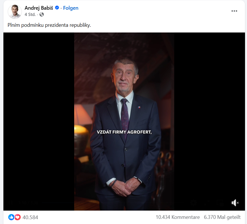 Präsident Petr Pavel forderte Babiš auf, noch vor seiner Ernennung zum Premier öffentlich bekannt zu geben, wie er den Interessenkonflikt lösen werde. "Damit habe ich die Forderung erfüllt, die der Präsident als Bedingung für meine Ernennung zum Ministerpräsidenten gestellt hatte", sagte Babiš.