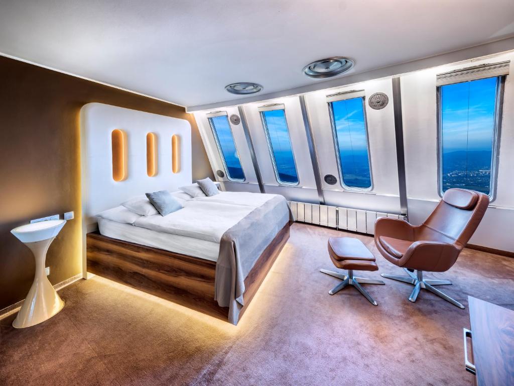 Das Berghotel und der Sender sind seit 1973 in Betrieb und gehören zu den originellsten architektonischen Werken in Tschechien. Der Architekt Karel Hubáček erhielt 1969 für das Projekt den renommierten internationalen Perret-Preis. Die Bevölkerung wählte das Gebäude außerdem zum tschechischen Bauwerk des 20. Jahrhunderts. Das Radiokommunikationsunternehmen ČRa besitzt das Hotel und den Sender seit dem Jahre 2000, verfügt aber nicht über die Mittel, um den Standard halten zu können und versucht bereits seit 2008, das einzigartige Gebäude zu verkaufen. Das Hotel Ještěd wurde auch dem Kulturministerium und der Stadt Reichenberg angeboten, jedoch zeigten beide Institutionen kein Kaufinteresse.